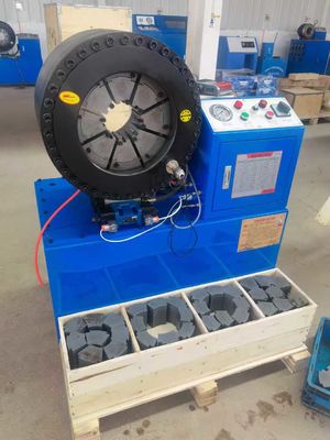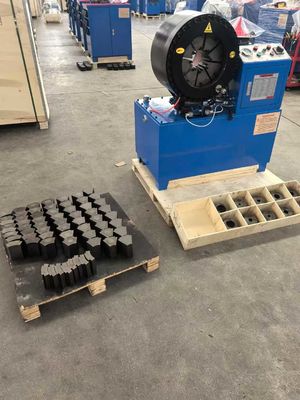 Deze 4 Inch Hydraulische Rubberen Slangkrimpmachine heeft een speciaal ontwerp met 16 matrijzen die handig aan de zijkant hangen voor gemakkelijke toegang. Met een krimpbereik van 6-102 mm (1/4" tot 4") biedt deze blauwe industriële machine een efficiënte werking voor verschillende slangkrimp toepassingen.